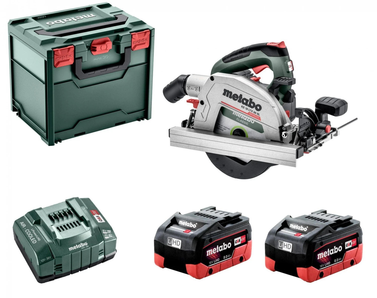 Hardmetalen cirkelzaagblad (18-tands), Parallelgeleider, Inbussleutel, 2 LiHD accu-packs (18 V/8,0 Ah), Supersnellader ASC 145 “AIR COOLED”, metaBOX 340